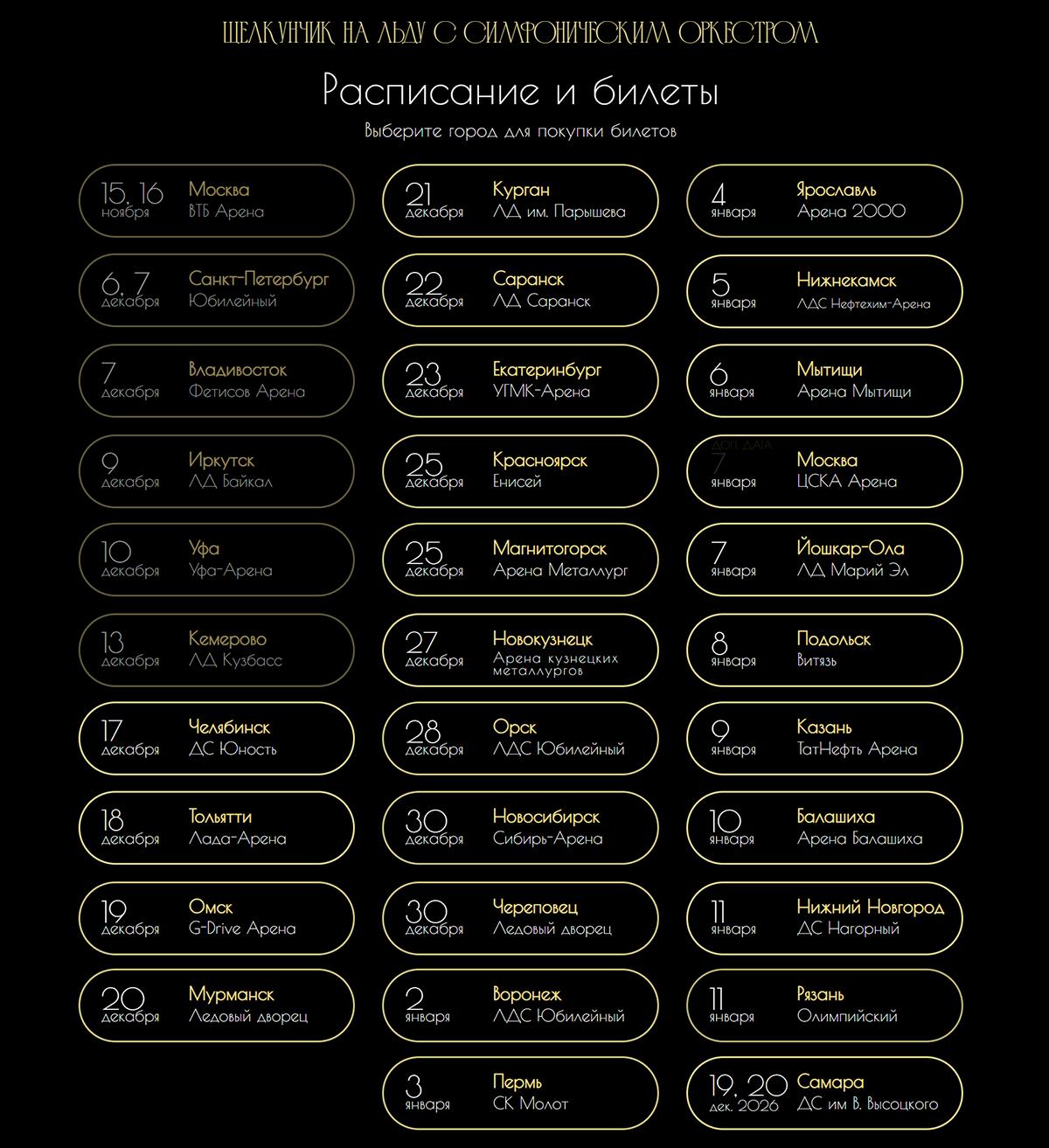 «Мероприятие „Щелкунчик на льду с симфоническим оркестром“, заявленное на 11:00 17 декабря 2025 года в ДС „Юность“, переносится на 18 декабря 2026 года. Все ранее купленные билеты будут действительны в новую дату проведения мероприятия. С уважением, Городские зрелищные кассы».