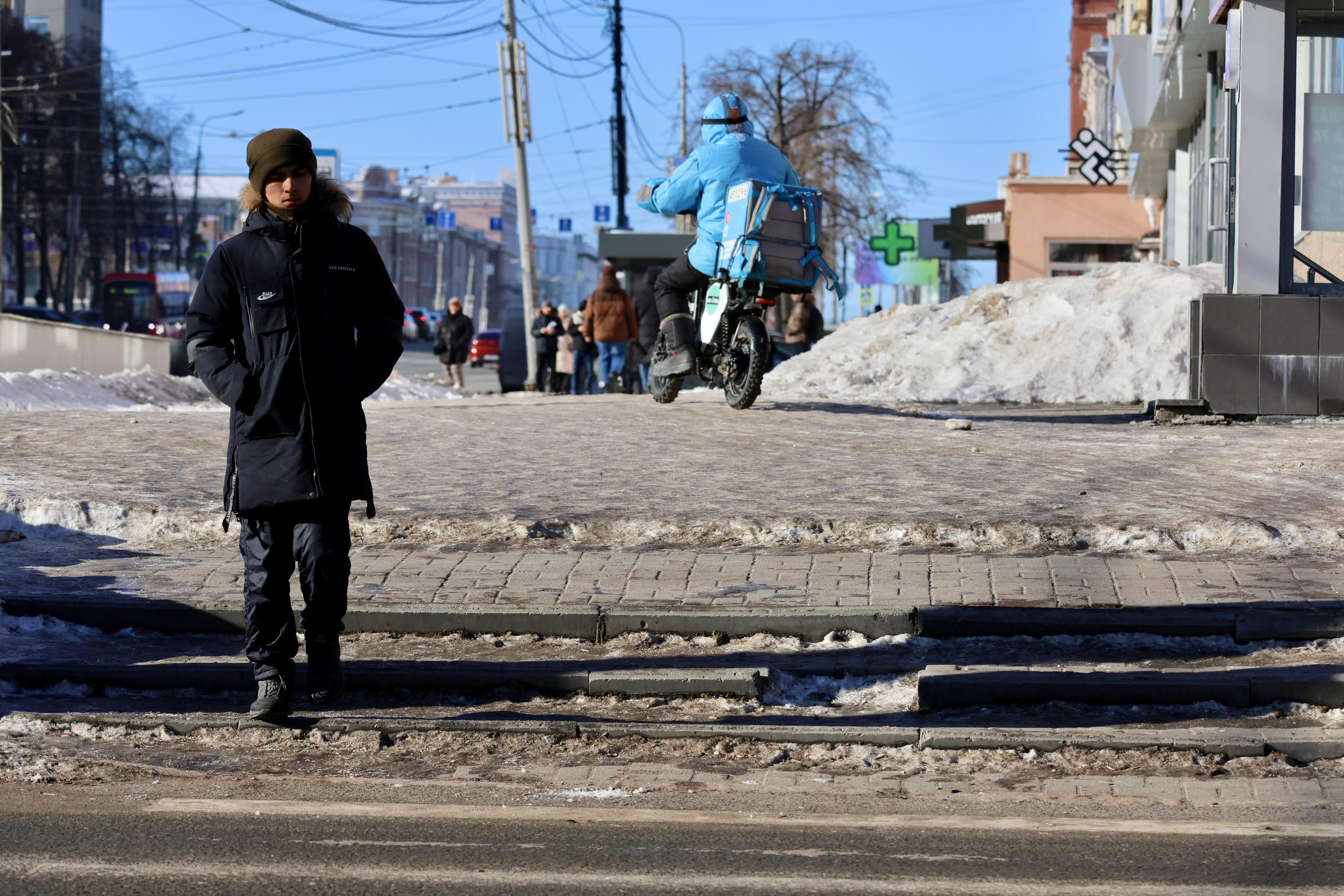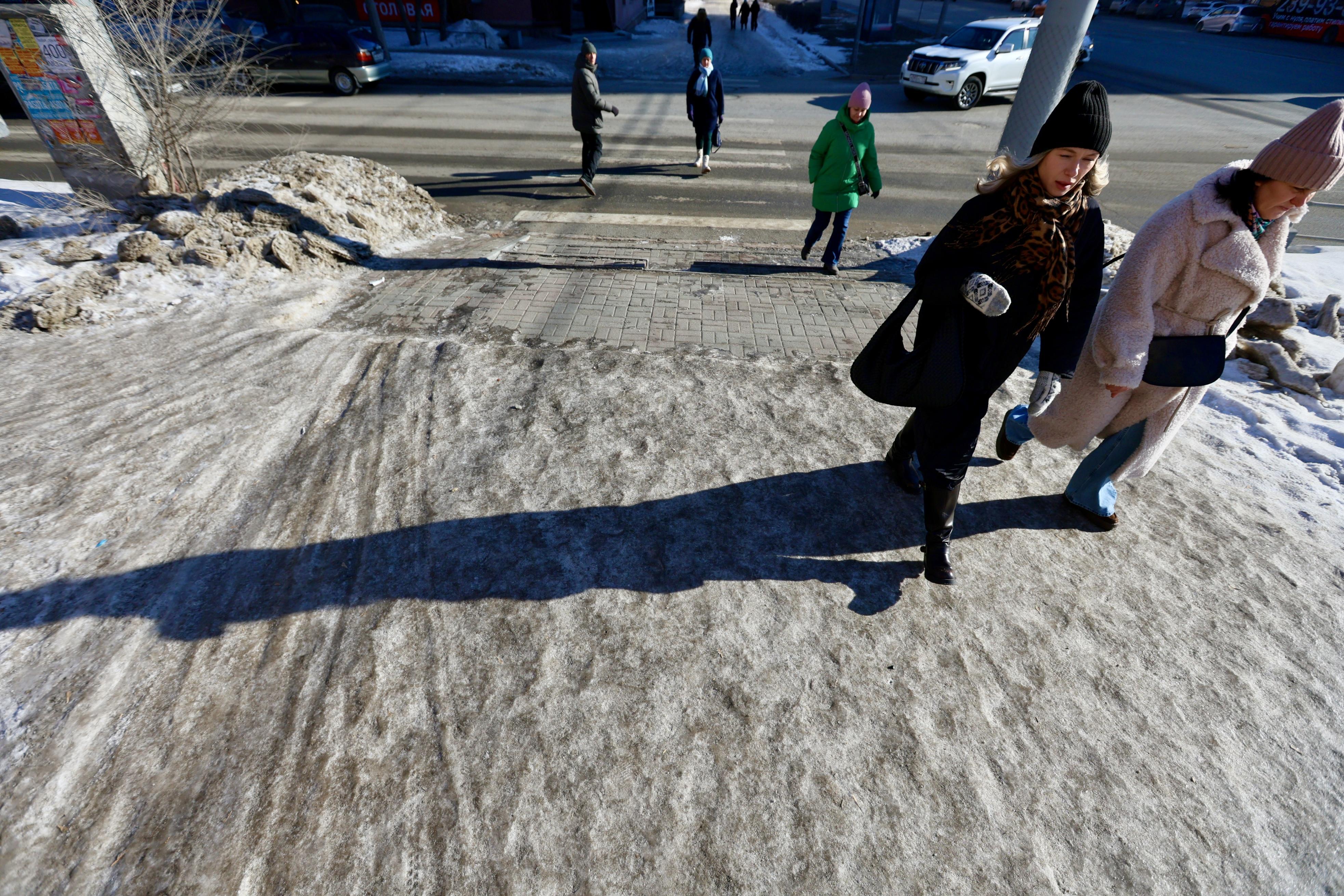 Широкие тротуары покрыты льдом и напоминают каток.